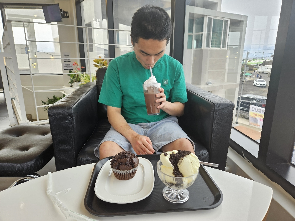 * 식사 후 민생지원금 사용하여 겨울에 입을 잠파와 신발 구입함. * 조천해안도로 도보활동 하였고 중간에 비가 와서 근처 카페에서 비를 피함. 음료와 빵, 아이스크림 주문하여 맛있게 먹음. * 돌아오는 길에 편의점에 들려 간식거리들을 구매 한 뒤 귀원함. |