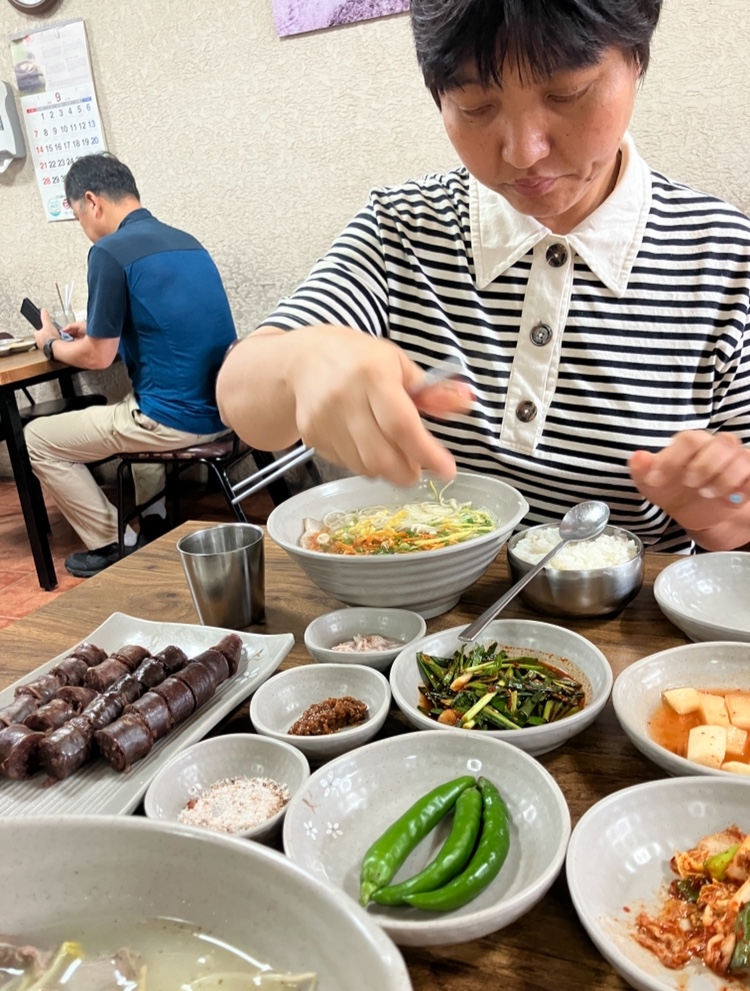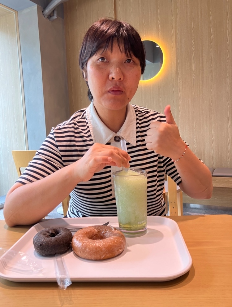 - 던킨 제주화북점에 방문하여 자신이 먹고 싶은 도넛을 직접 집게로 잡아 트레이에 넣고 계산한 후 음료와 맛있게 먹었습니다. - 머리사랑미용실에 가서 염색과 커트를 하였습니다. 미용사분께 '머리 예쁘게 해주세요'라고 말을 하는 모습을 볼 수 있었습니다. - 화북BYC에 방문하여 잠옷과 속옷을 구매한 후 친정집 식당에 가서 고기국수, 순대 등을 맛있게 먹었습니다. 밥을 다 먹은 후 식당 직원분께 엄지손가락을 들며 '맛있었어요'라고 표현하는 모습을 볼 수 있었습니다. |