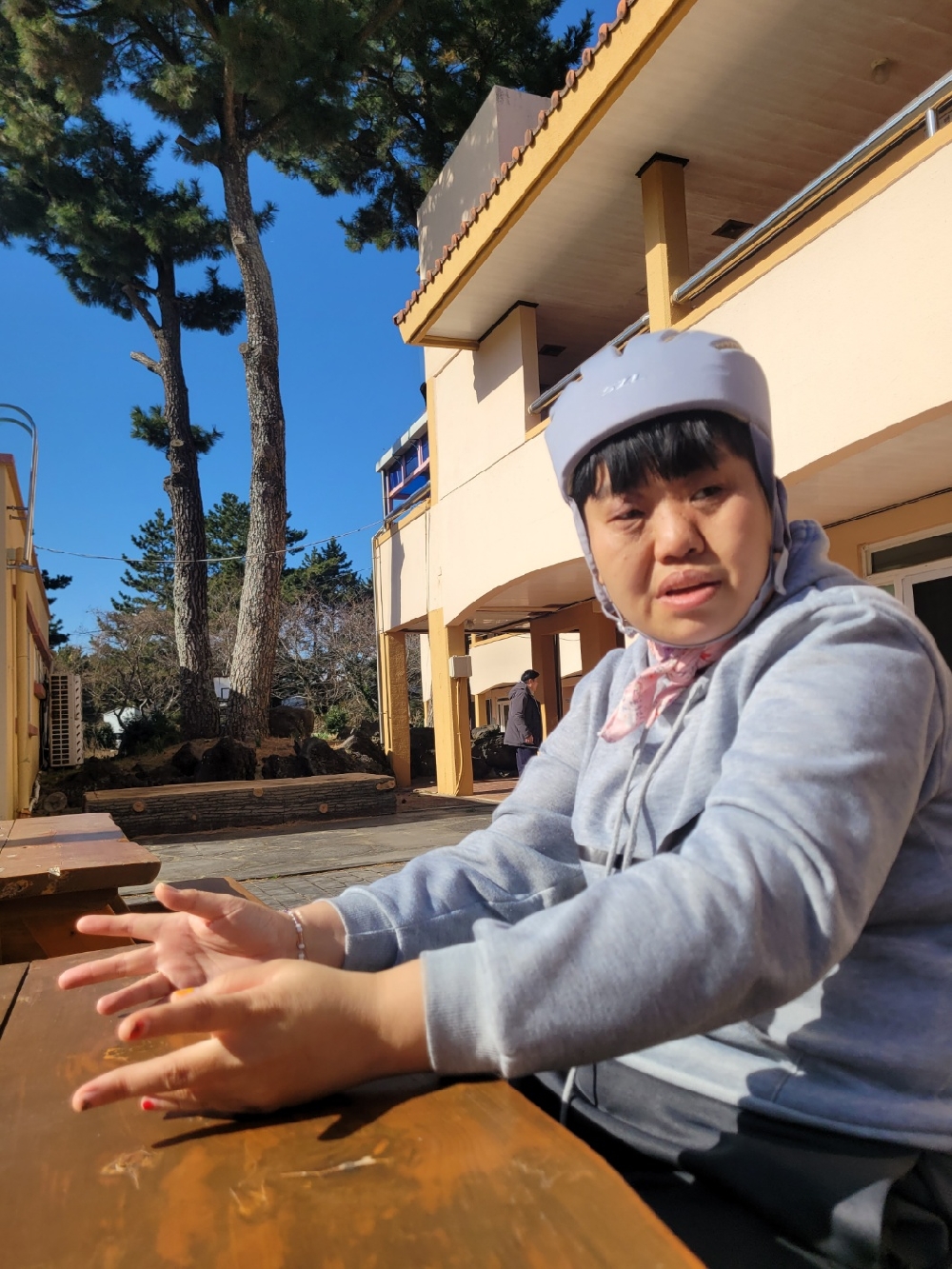 - 날씨가 따뜻한 날에는 생활실 앞 벤치에 앉아서 햇볕을 친구들과 이야기를 나누기도 하였습니다