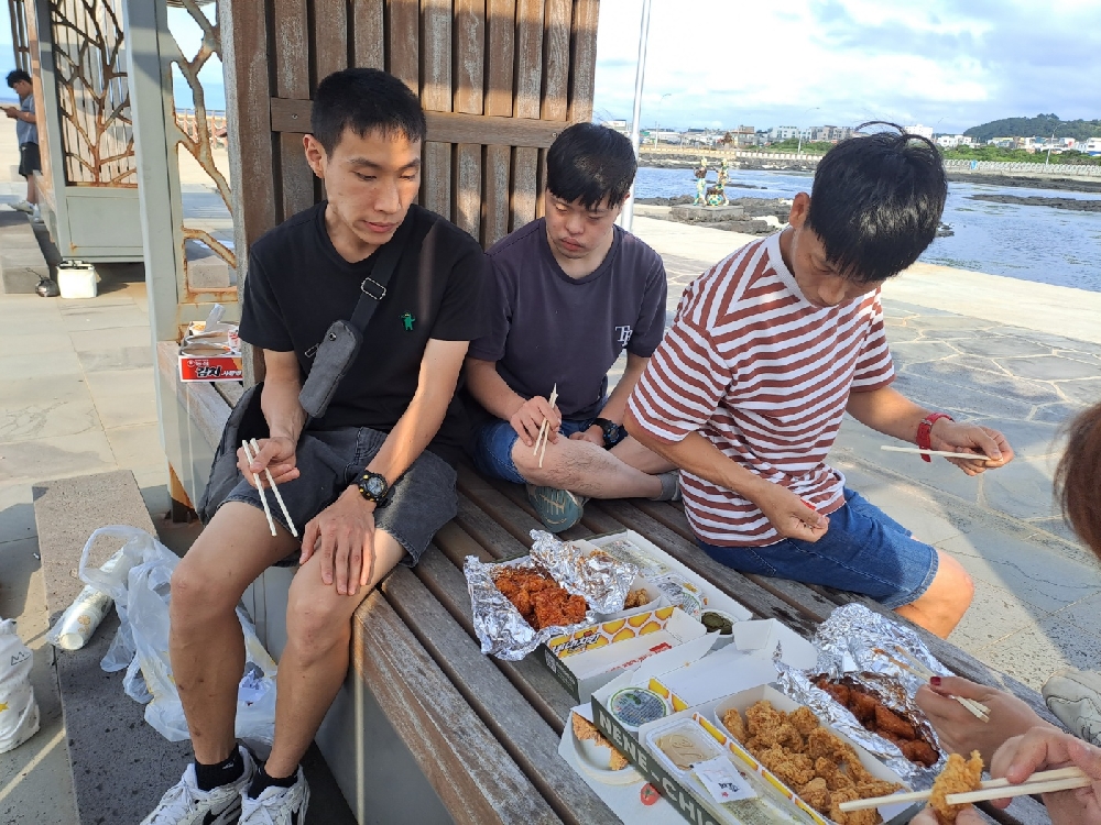- 여자 체험홈 이용자들과 김녕 방파제에서 쓰레기 줍기 활동함. 이 후 바닷가 산책 후 저녁식사로 치킨, 라면 먹음. 이용자들과 낚시함,
